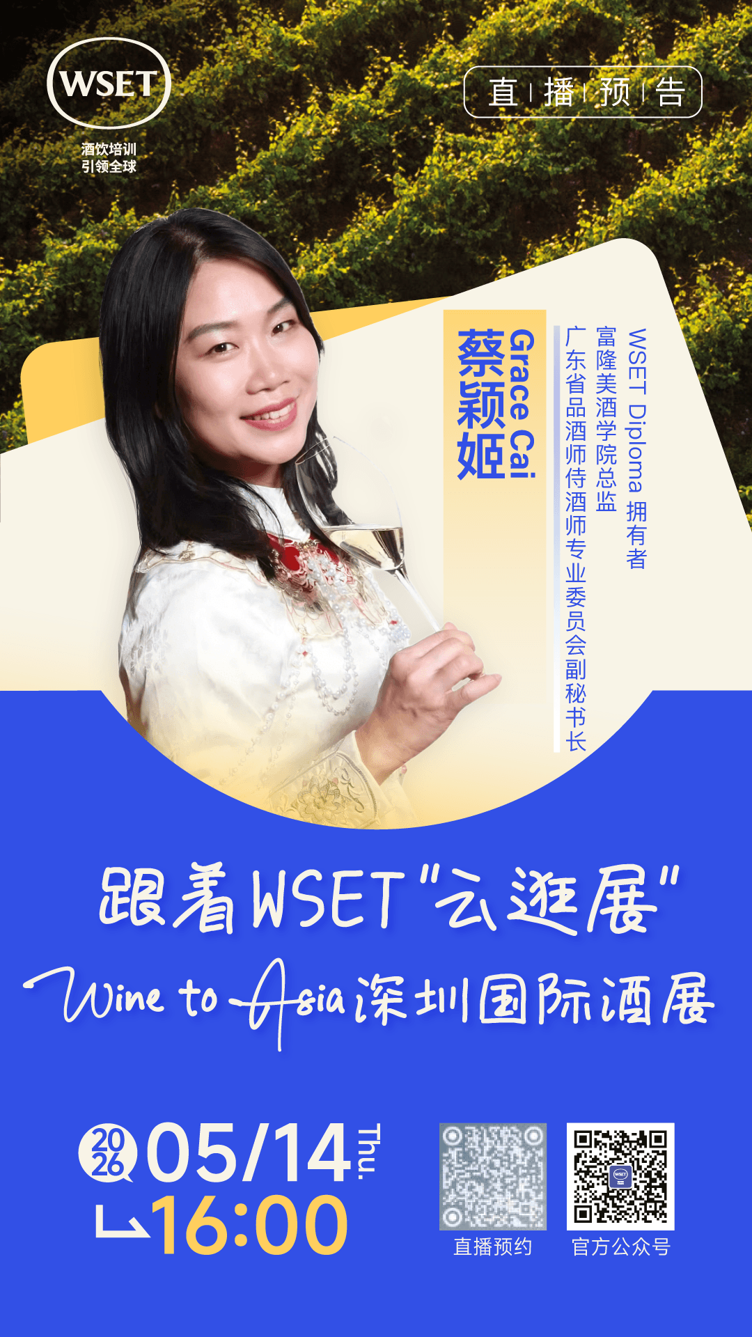为了让无法莅临现场的朋友也能同步感受和了解,我们将在开展首日5月14日下午4点开启“云”逛展直播,跟随富隆美酒学院总监、广东省品酒师侍酒师专业委员会副秘书长、WSET Diploma拥有者Grace Cai 蔡颖姬的脚步,深入了解本次Wine to Asia展区中,